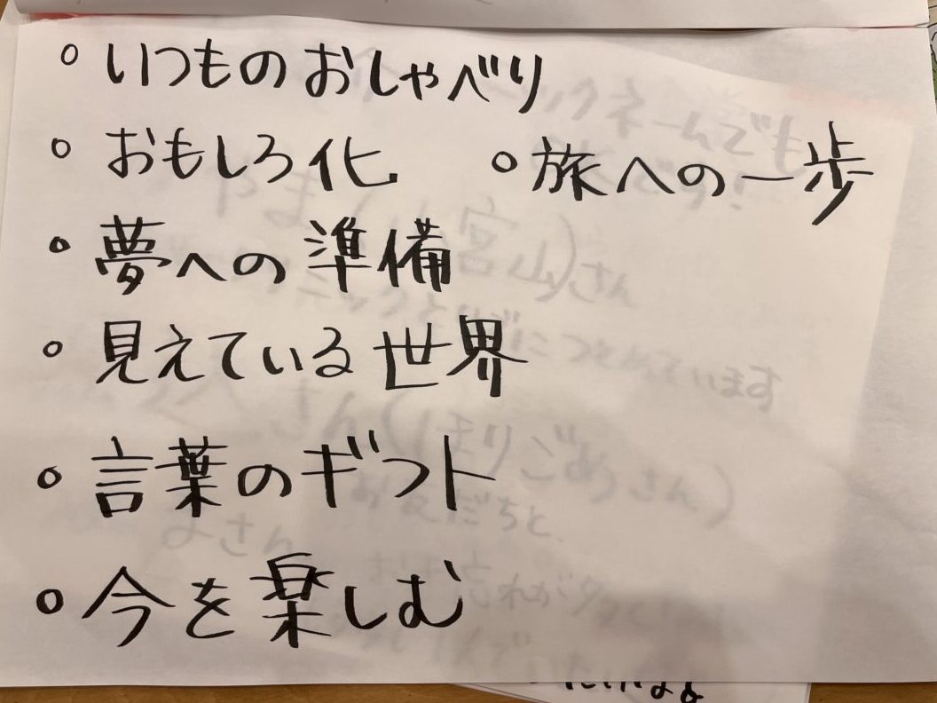 『旅のことばカード』を通じて対話をするのは初めての方がほとんどで、「旅のことば」から新たな気づきを得てこれからの行動に活かそうとしたり、自らの生き方の肯定感を高めたりと、心が揺さぶられた様子の方が多くいらっしゃいました。中には、涙を流していらっしゃった方も。涙を流されていらっしゃる方も。悲しい涙ではなく「自分のことを分かってもらえる場に来られて良かった!嬉しい!」という涙だったそうです。実験パートナーの藤井さんが「旅のことばカードマジック」と呼んでいる、不思議な場が生まれたように思います。