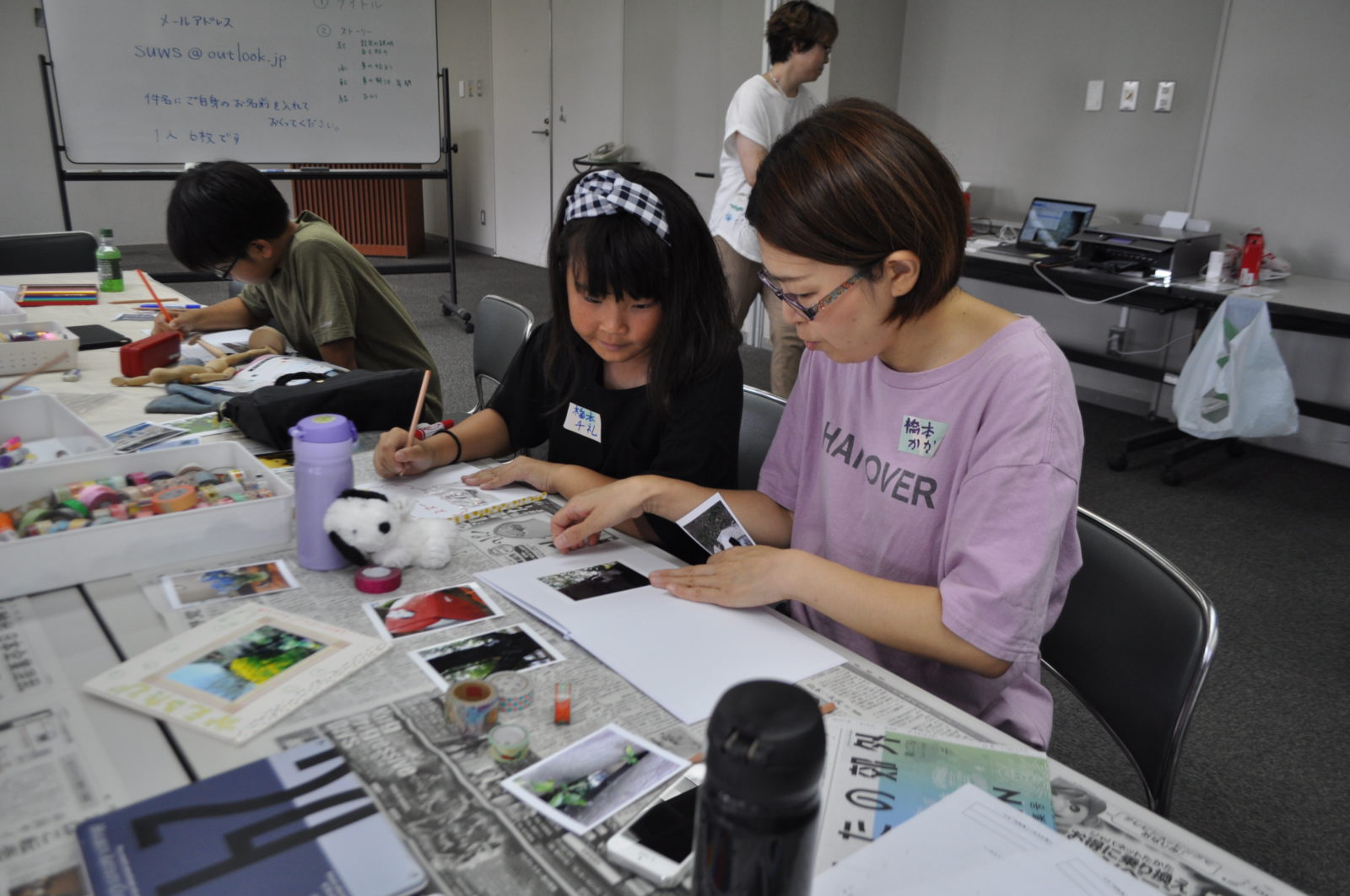 撮影を終えたら、会場に戻り写真のプリントアウト。出力が終わり手元に届いた写真を使い、絵本の制作時間に入りました。参加者それぞれが黙々と手を動かし、ペンや色鉛筆を使ったり、マスキングテープを使ったり、写真を並べたりして制作に取り掛かります。