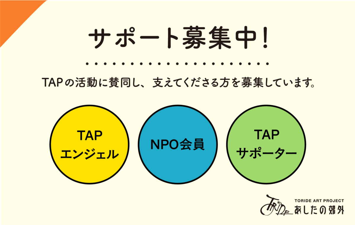 TAPの活動に賛同し、活動を支えてくださる方を募集しています。イベント運営、事務作業などのボランティア(TAPサポーター)と、一口3,000円からのご寄附(TAPエンジェル)によるご支援があります。NPO法人取手アートプロジェクトオフィスの会員として活動を応援していただける方も歓迎します。