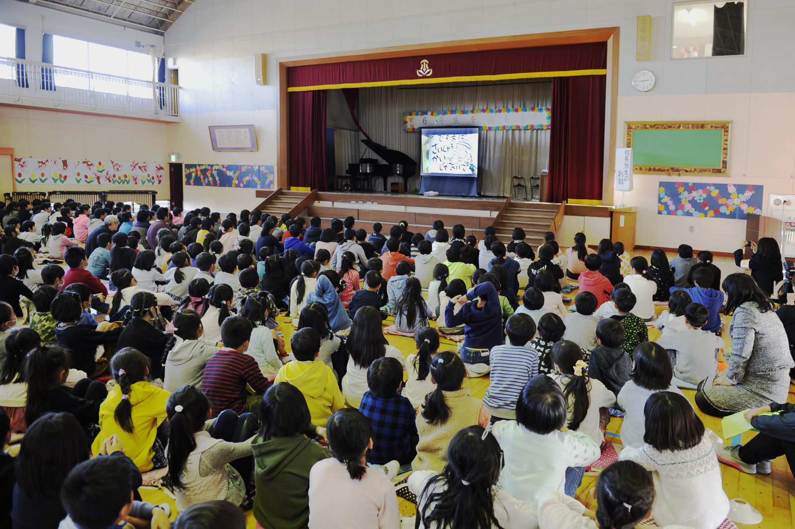 そう言い残してステージ幕の裏に姿を消す校長先生、どよめく児童たち…するとおもむろにステージの幕があいてスクリーンが現れ、「リカちゃんハウスちゃん」のマンガがはじまりました!