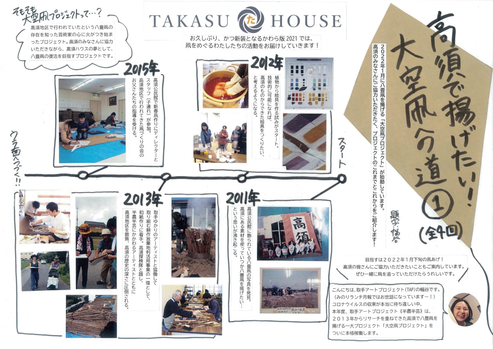 10年に渡るさまざまなリサーチや実験を経て、ついに2022年1月23日に八畳凧をふたたび高須で揚げるべく、大空凧プロジェクトが動き出しました。凧揚げ日を目指し、高須公民館で回覧版に折り込んでいただいているかわら板では、プロジェクトを発信、進捗を追っていきます。初回はプロジェクトが始動するまでの経緯を紹介。かわら板はクリックしてご覧ください。